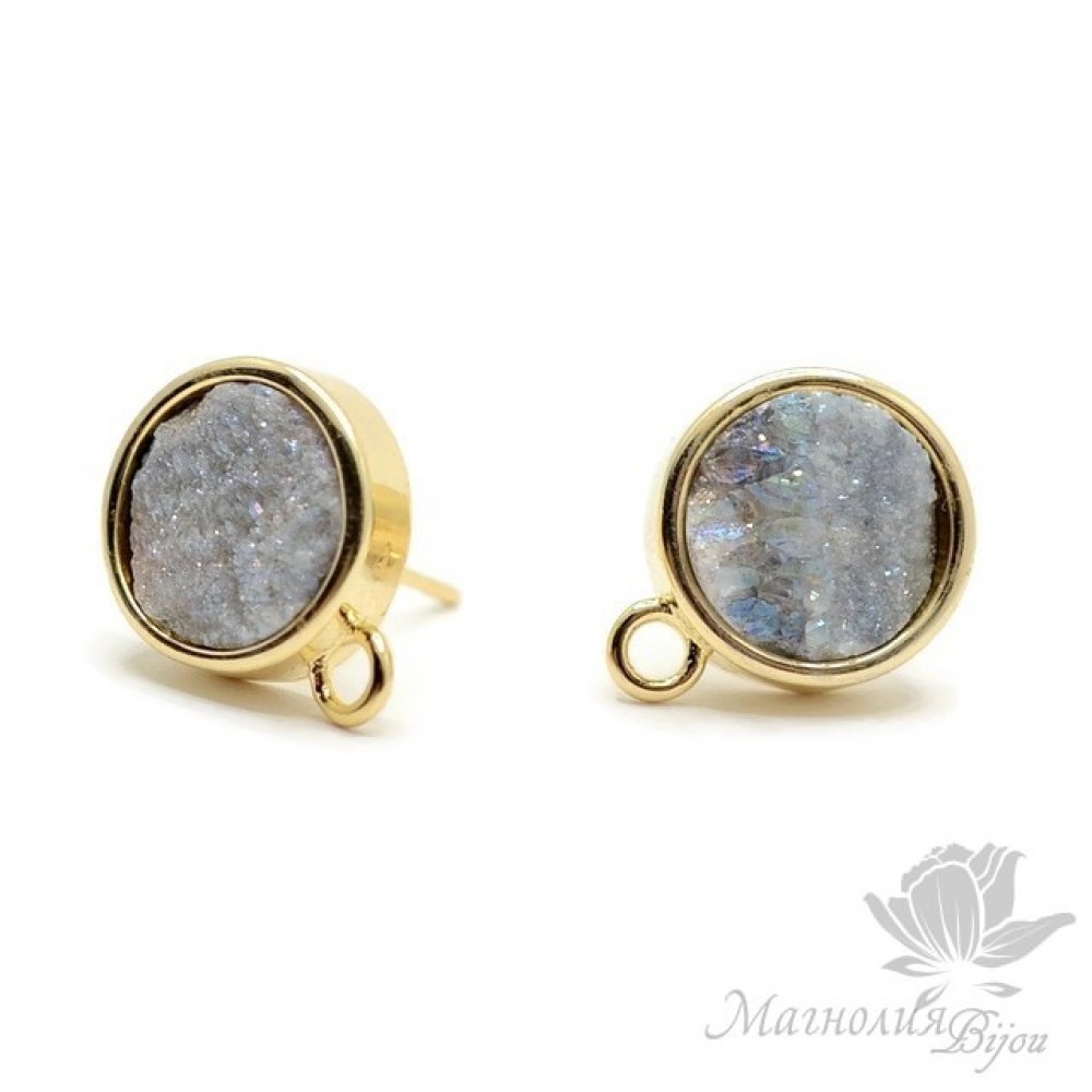ПУССЕТЫ с друзами агата "Grey" круглые, позолота