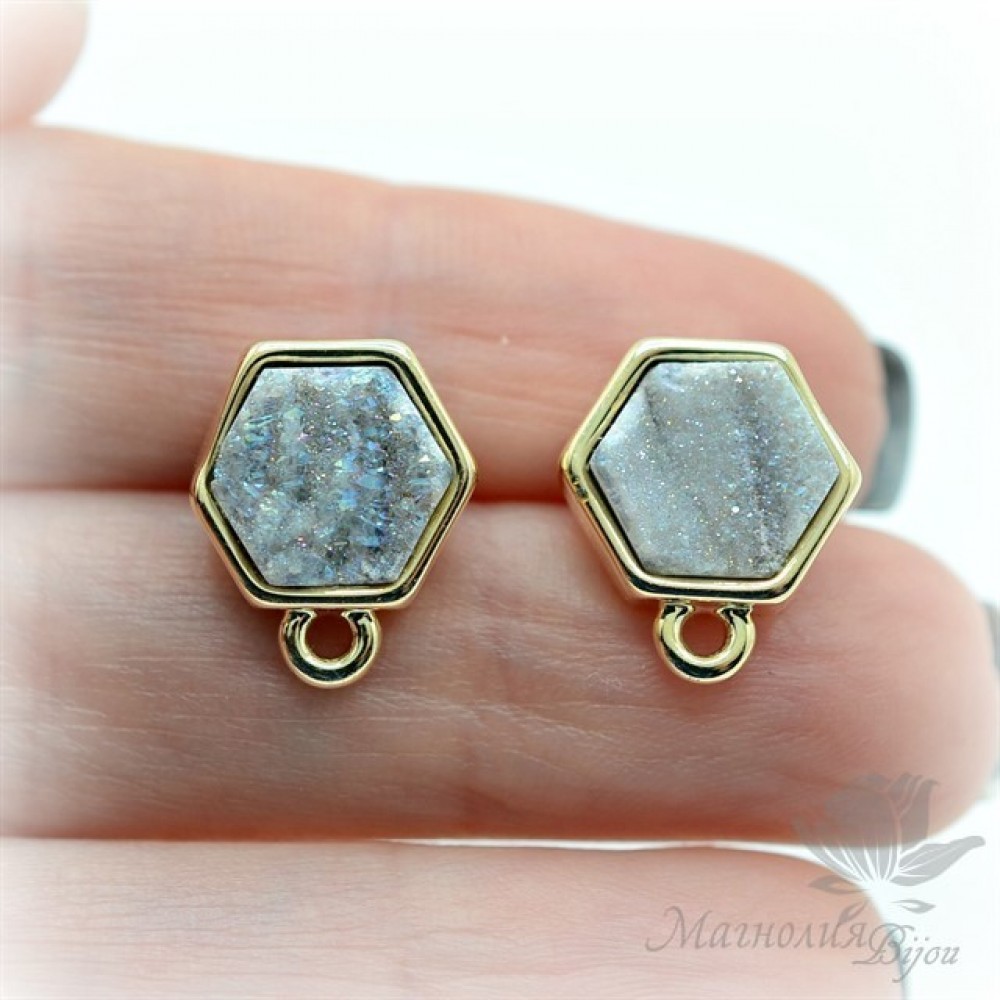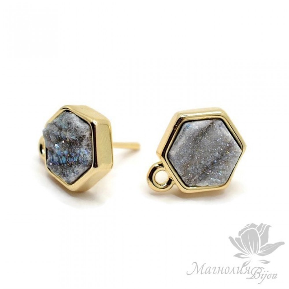 ПУССЕТЫ с друзами агата "Grey" шестигранные, позолота 18 карат